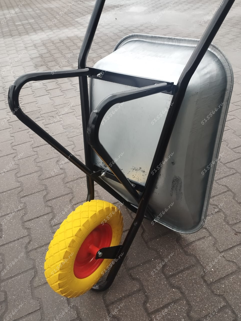 Средняя тачка на комбинированной раме, состоящей из двух сварных элементов с подпором бака и защитой колеса. Подходит для перевозки умеренно тяжелых строительных грузов. Рама изготовлена из оцинкованной трубы диаметром 32 мм, толщина стенки 1,2мм, цвет черный. Бак отформован из электрооцинкованного листа толщиной 0,7мм, цвет серый цинк. Пластиковые накладки на ручки.