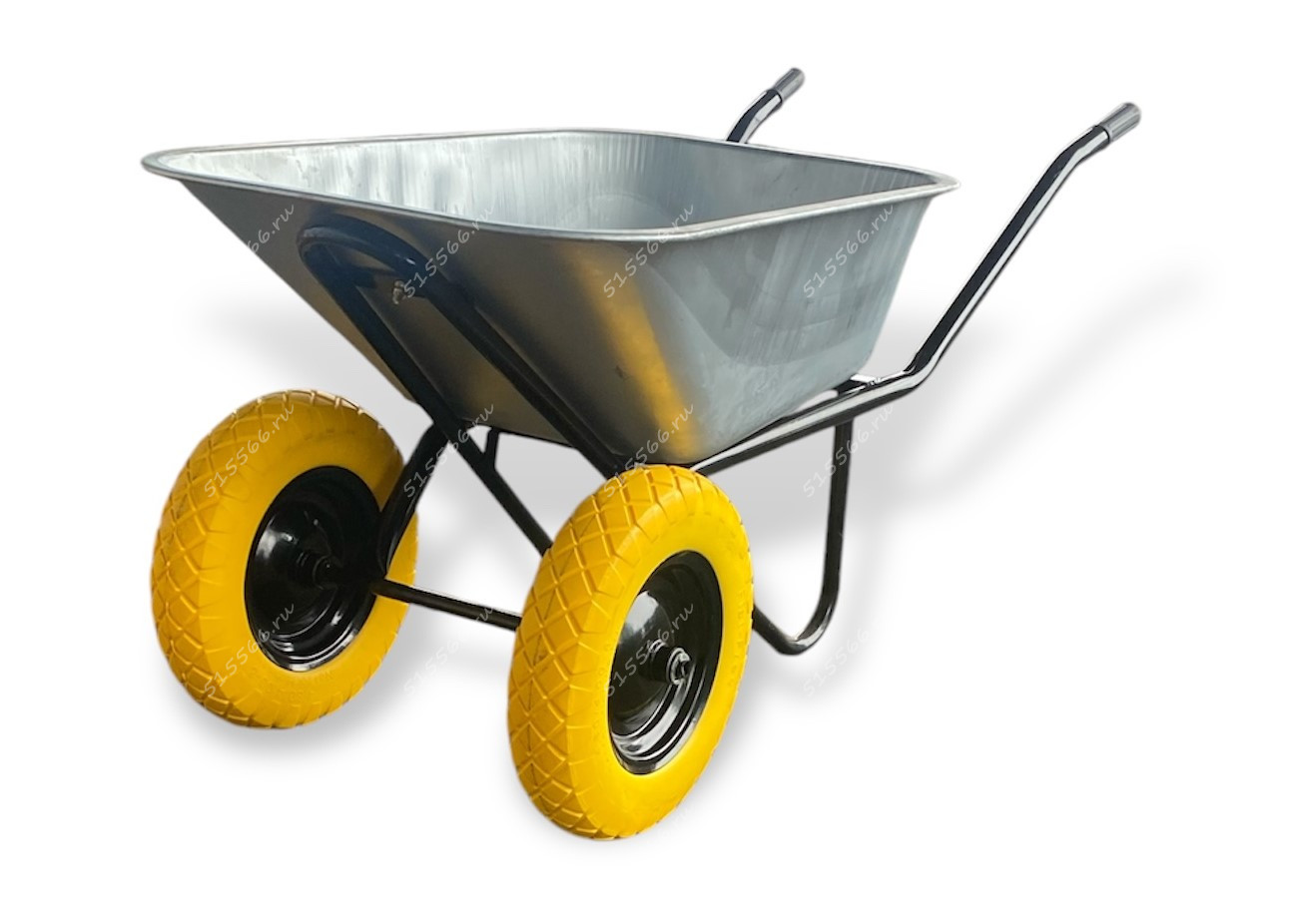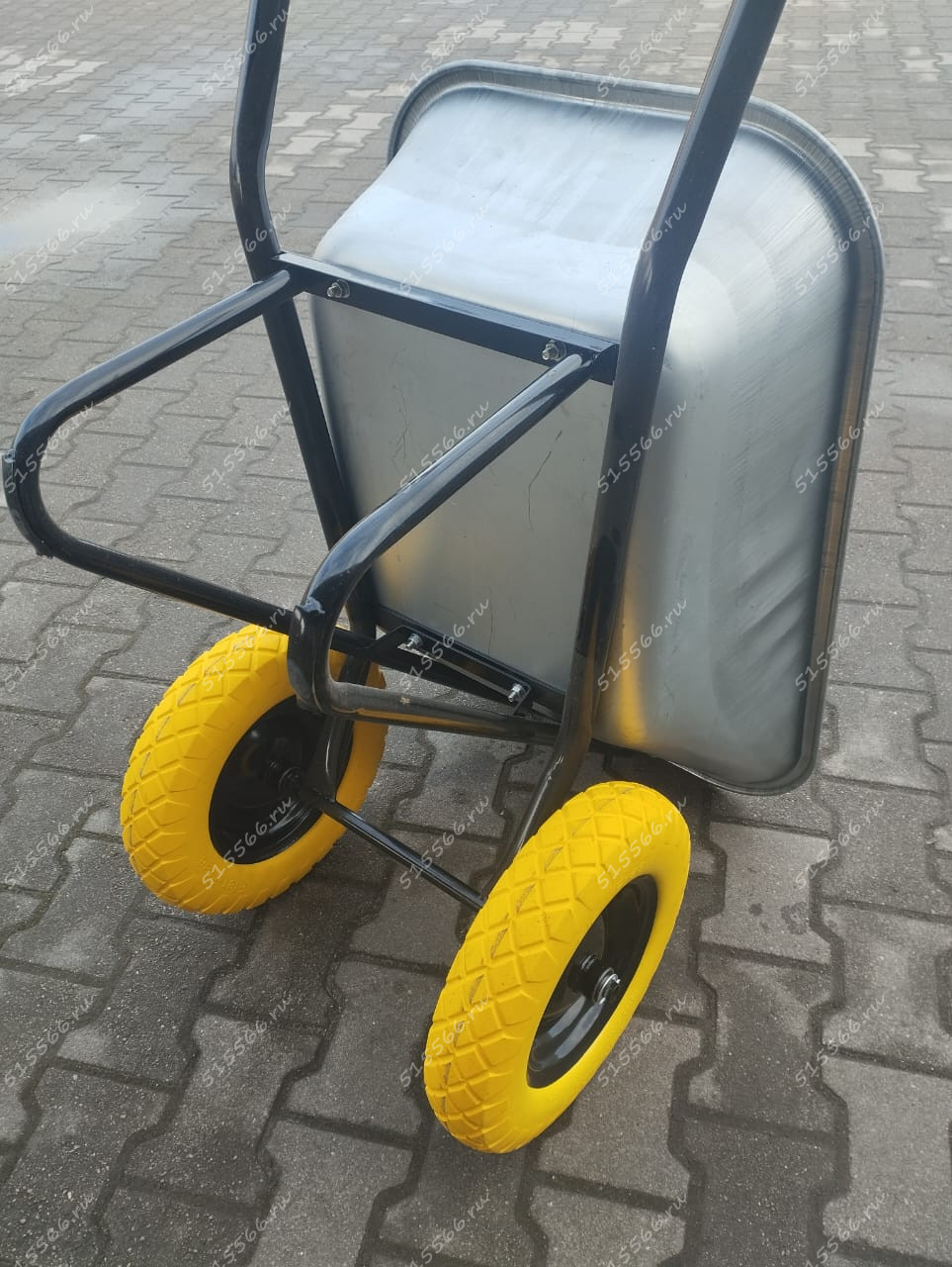 Двухколесная средняя тачка на комбинированной раме, состоящей из двух сварных элементов с подпором бака. Подходит для перевозки тяжелых строительных грузов. Не требует большой физической нагрузки. Рама изготовлена из оцинкованной трубы диаметром 32 мм, толщина стенки 1,2мм, цвет черный. Бак отформован из электрооцинкованного листа толщиной 0,7мм, цвет серый цинк. Пластиковые накладки на ручки.